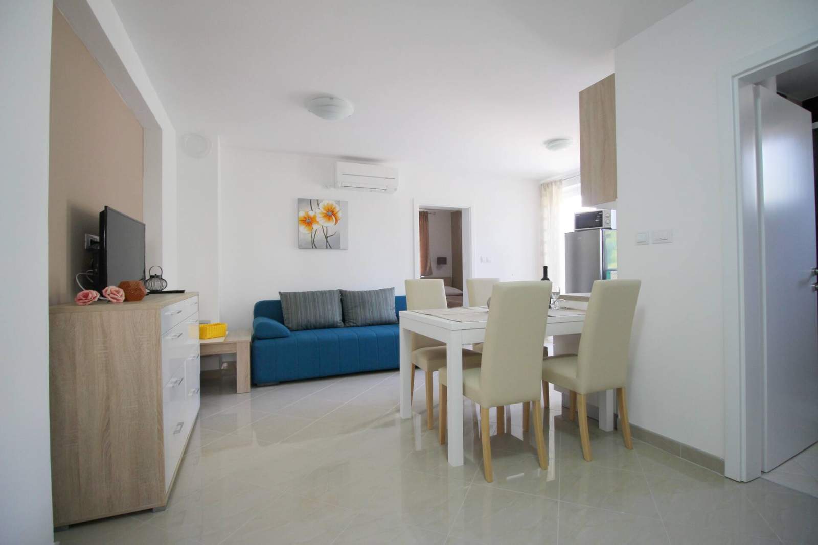 Apartman se sastoji od dvije spavaće sobe (jedne s bračnim krevetom te druge s dva kreveta za jednu osobu), kupaonice (tuš, WC, sušilo za kosu, perilica rublja), dnevnog boravka s jednim dodatnim ležajem na kauču i s klima uređajem, SAT TV-om, besplatnim Wi-Fi-jem i potpuno opremljenom kuhinjom. Kuhinja uključuje električni štednjak, hladnjak s zamrzivačem, perilicu posuđa, mikrovalnu pećnicu, aparat za kavu i kuhalo za vodu. Posuđe je uključeno.