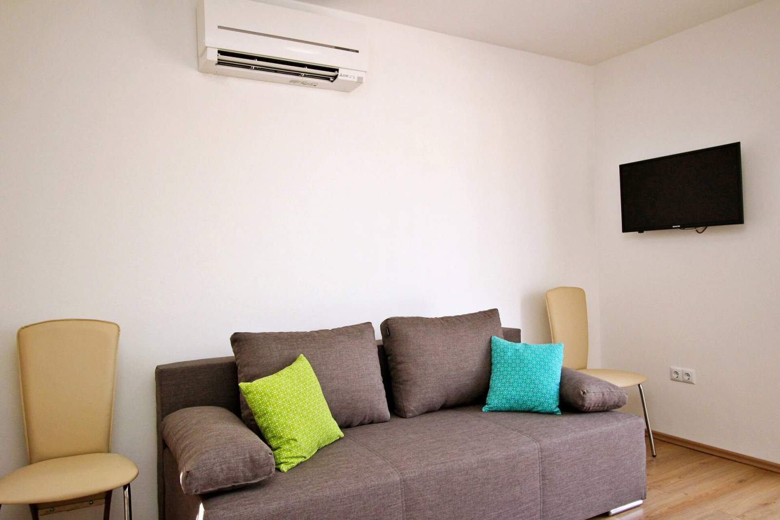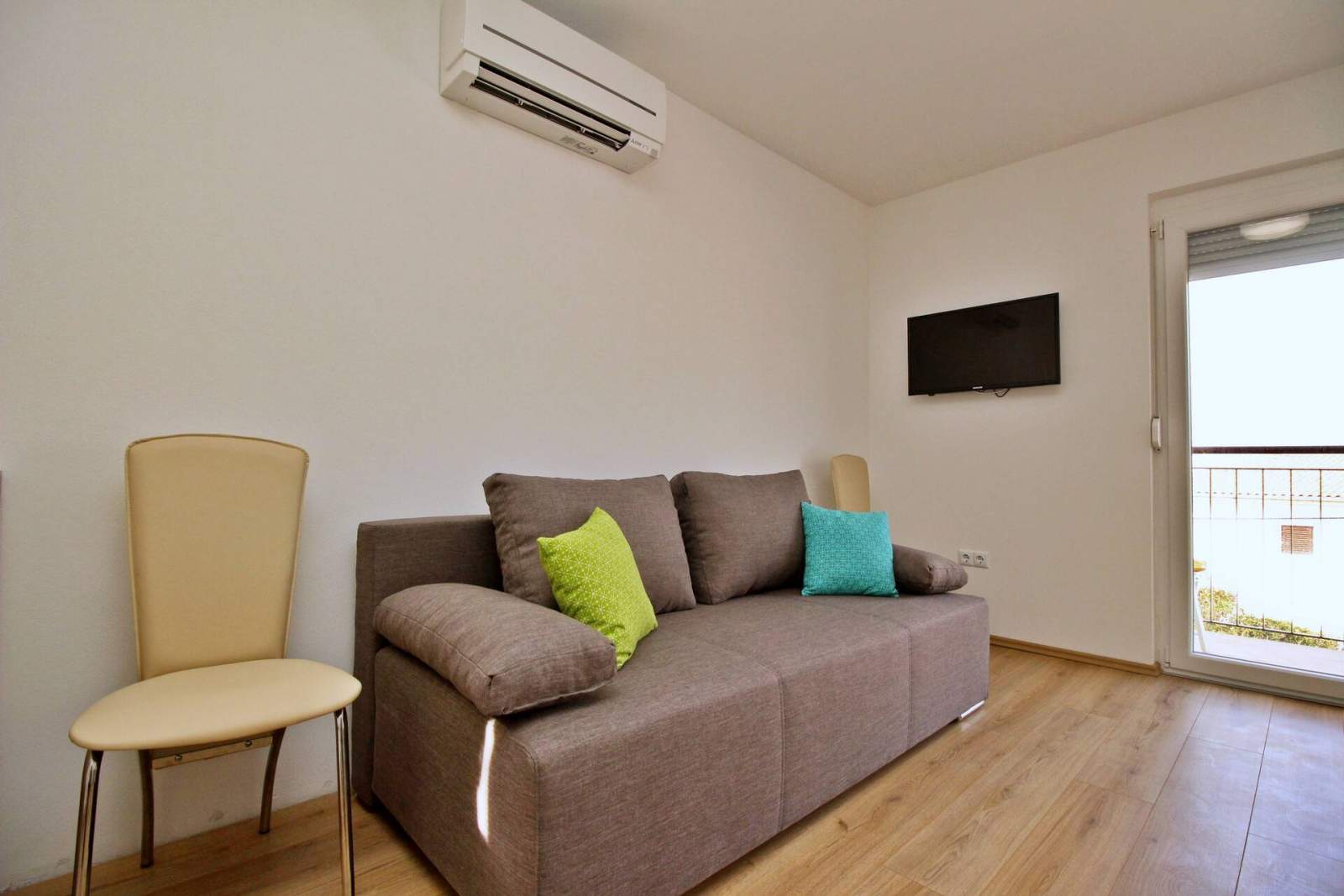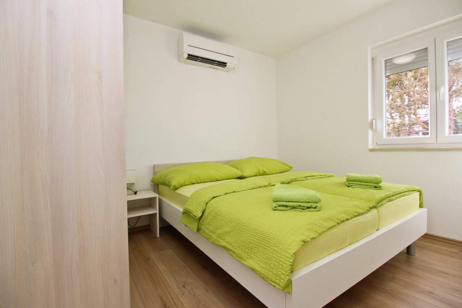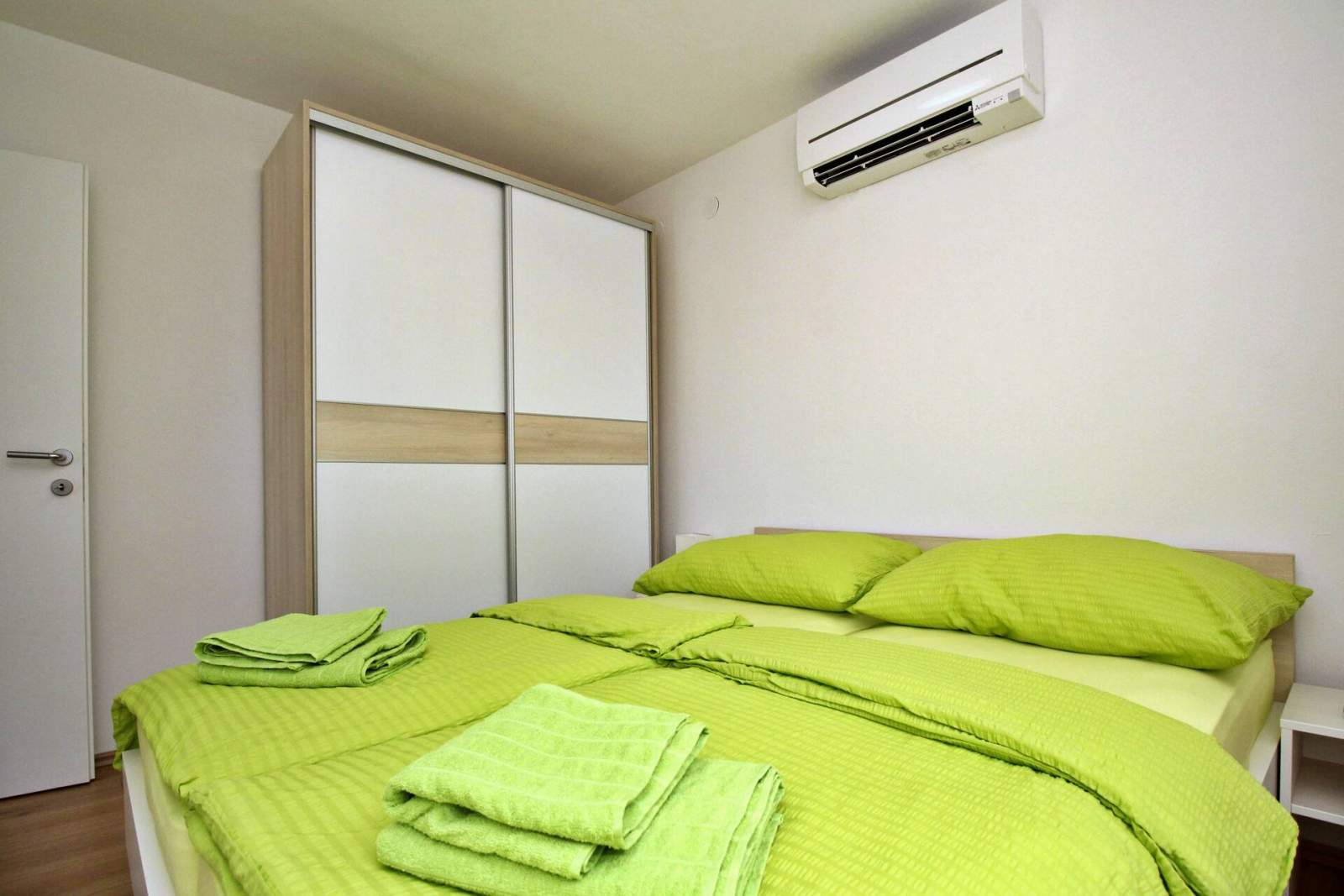 Ovaj je apartman idealan za obitelji ili grupe od 5-6 osoba te je smješten samo 60 metara od pješčane plaže i 250 metara od centra mjesta. Apartman se nalazi na 1. katu i ima dvije klimatizirane spavaće sobe — jednu s bračnim krevetom i drugu s dva jednostruka kreveta — te dnevni boravak s kaučem na razvlačenje za dvije osobe. Kuhinja je opremljena sa električnim štednjakom, pećnicom, hladnjakom sa odjeljkom za zamrzavanje, aparatom za kavu, kuhalom za vodu i mikrovalnom pećnicom. Dnevni boravak ima izlaz na privatni balkon (4 m2) s prekrasnim pogledom na more, savršen za uživanje u jutarnjoj kavi ili večernjem opuštanju.