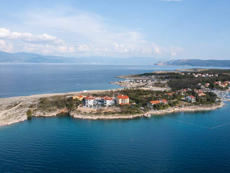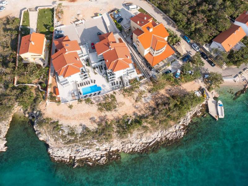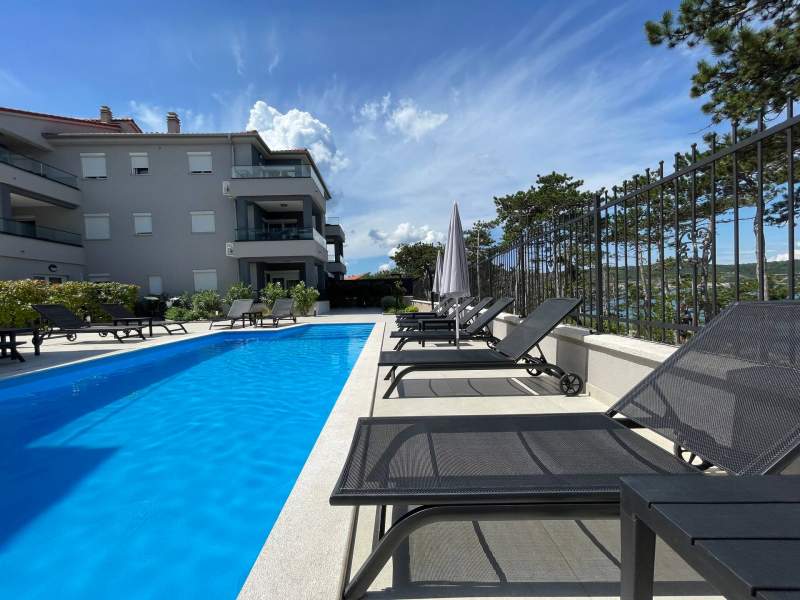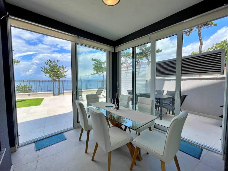 Ovaj apartman nalazi se u prizemlju, ima 2 spavaće sobe te u njemu mogu boraviti maksimalno 4 osobe. Moderno je opremljen s četiri klima uređaja i tri Smart TV-a sa satelitskim programima (u dnevnoj sobi i spavaćim sobama). Kuhinja ima indukcijsku ploču za kuhanje s odgovarajućim posuđem, hladnjak s odvojenim zamrzivačem, aparat za kavu, toster, kuhalo za vodu, perilicu suđa i mikrovalnu pećnicu. Apartman ima verandu koja služi kao blagovaonica (može se zatvoriti te ima klima uređaj). Terasa je u potpunosti ograđena i privatna. Na terasi se nalaze ležaljke za sunčanje, sjedeća garnitura sa suncobranom, dodatan stol za blagovanje, jacuzzi, hladnjak za piće te vanjski tuš. S terase se može izaći na more ili na bazen koji se nalazi na susjednoj terasi.