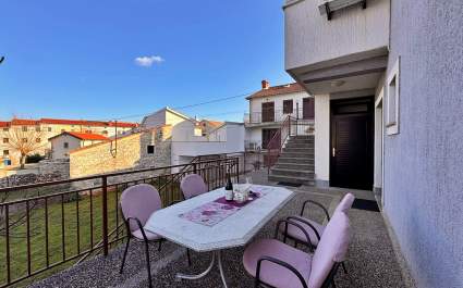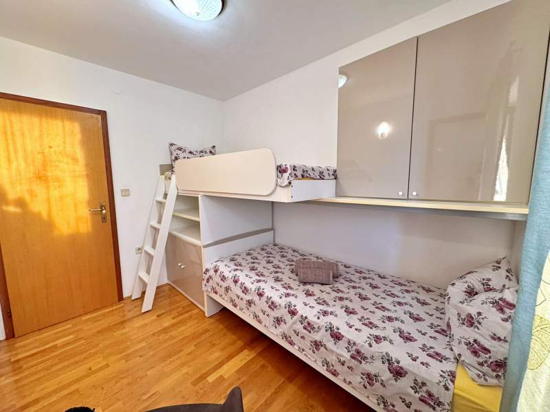 Smještaj za odmor od 80 m2 na 2. katu udaljen je 500 m od mora i idealan je smještaj za obitelji. Apartman ima potpuno opremljenu kuhinju sa staklokeramičkom pločom za kuhanje, pećnicom, hladnjakom sa zamrzivačem, aparatom za kavu, kuhalom za vodu, i stolom za blagovanje. Dnevni boravak nudi kauč, WiFi i klima uređaj. U hodniku se nalazi drugi klima uređaj.