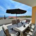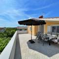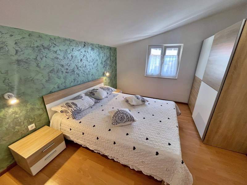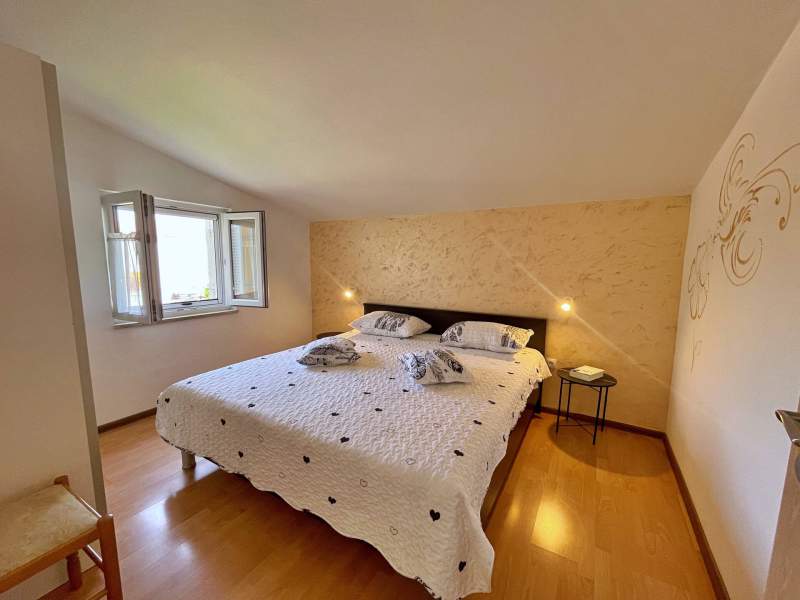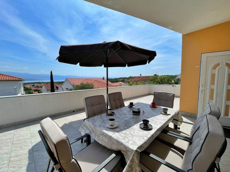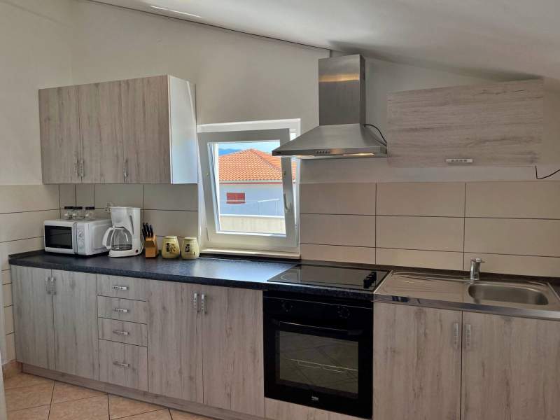 Ovaj apartman na prvom katu, udaljen oko 800 metara od mora i centra mjesta, idealan je za obitelji ili manje grupe željne udobnosti. Sadrži tri spavaće sobe, svaka s bračnim krevetom, kao i kauč na razvlačenje u dnevnoj sobi. Prostrana, djelomično natkrivena terasa (30 m2) ima blagovaonski stol i pogled na more. Potpuno opremljena kuhinja uključuje električni štednjak (ceran ploča), hladnjak sa zamrzivačem, pećnicu, mikrovalnu pećnicu, toster, aparat za kavu i kuhalo za vodu. Dnevni boravak ima klima uređaj, udoban kauč i blagovaonski stol sa satelitskom/kabelskom televizijom. Kupaonica je opremljena tušem, WC-om, perilicom rublja i sušilom za kosu. Dodatni sadržaji uključuju besplatan Wi-Fi, parking, zajednički roštilj u dvorištu i dječji krevetić na upit. Kućni ljubimci su također dobrodošli uz nadoplatu!