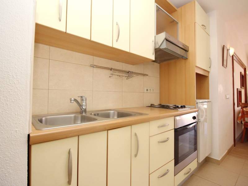 Apartman uključuje potpuno opremljenu kuhinju, dnevni boravak s blagovaonicom i dodatnim ležajem na kauču, kupaonicu (tuš, WC) i balkon (10 m2).