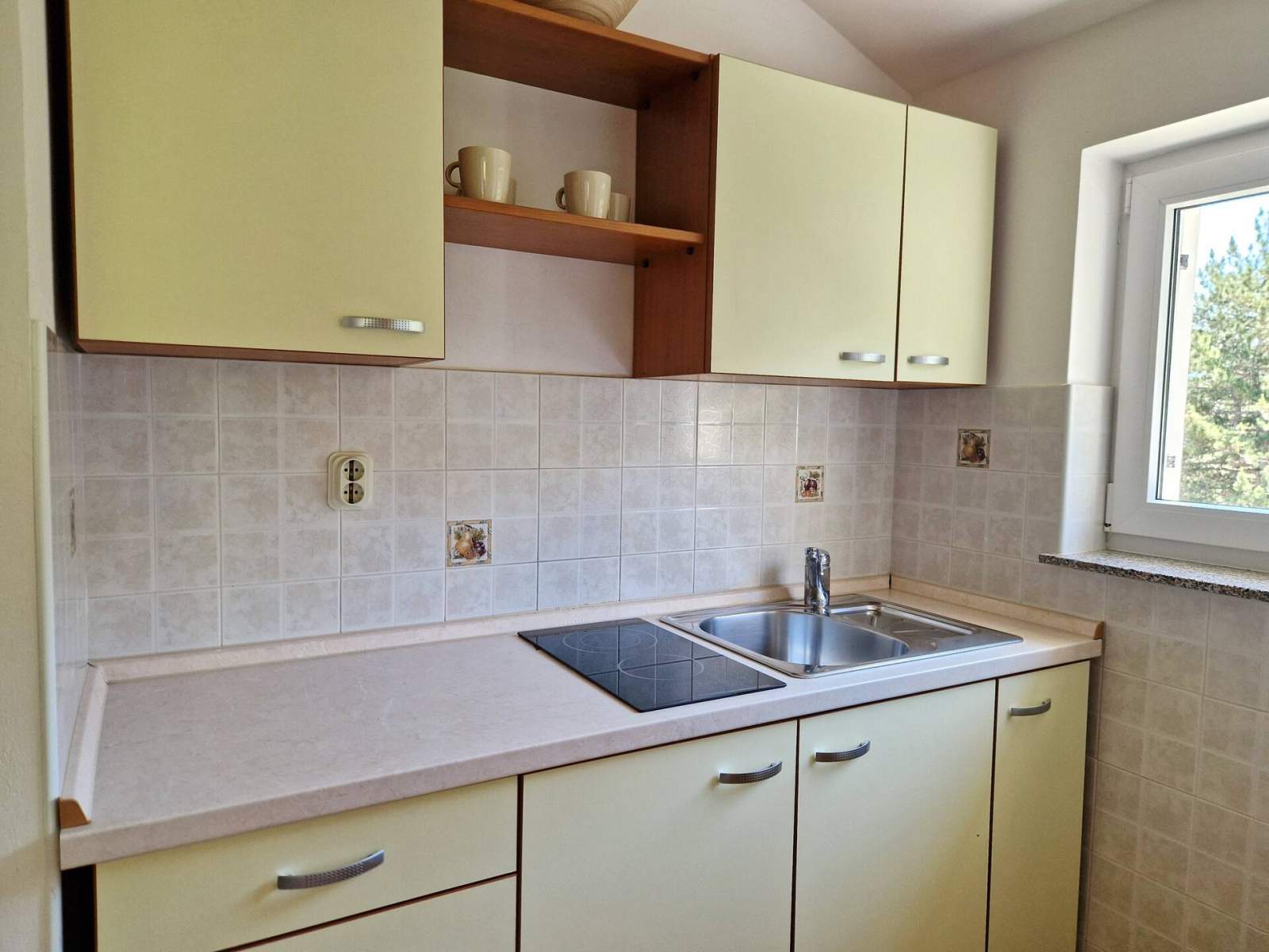 Apartman uključuje potpuno opremljenu kuhinju s blagovaonicom i dodatnim ležajem na kauču, kupaonicu (tuš, WC) i balkon (4 m2).
