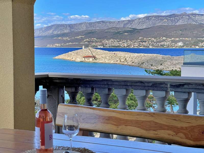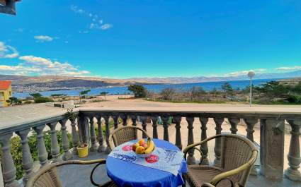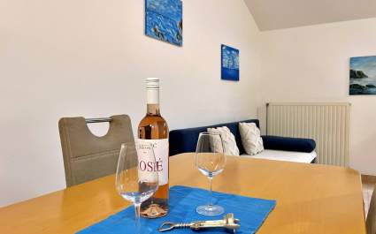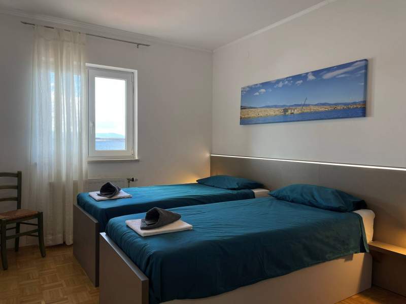 Ovaj apartman nalazi se samo 20 metara od mora i plaže na prvom katu i ima dvije spavaće sobe — jednu s bračnim krevetom i drugu s dva odvojena jednostruka kreveta. Otvoreni dnevni boravak, blagovaonica i kuhinja uključuju kauč, klima uređaj i satelitsku/kabelsku TV. Kuhinja je opremljena indukcijskim štednjakom s 4 kola, hladnjakom sa zamrzivačem, aparatom za kavu, kuhalom za vodu i tosterom. Kupaonica ima tuš i WC. Zakoračite na terasu (10 m2) s vanjskim namještajem i uživajte u zadivljujućem pogledu na plavo more. Gostima su na raspolaganju posteljina, ručnici, besplatan Wi-Fi i parkirno mjesto. Popularni lokalni bistro i ronilački centar smješten je u prizemlju, nudeći tradicionalnu mediteransku kuhinju i podvodnu avanturu. U ronilačkom centru možete dogovoriti uron s broda ili s obale.