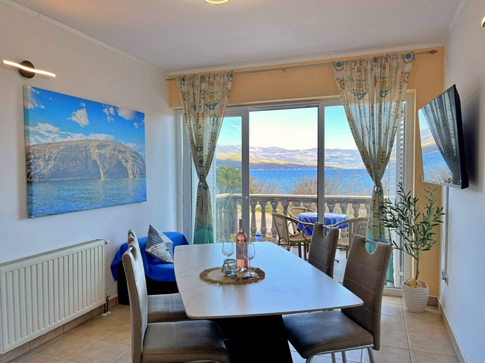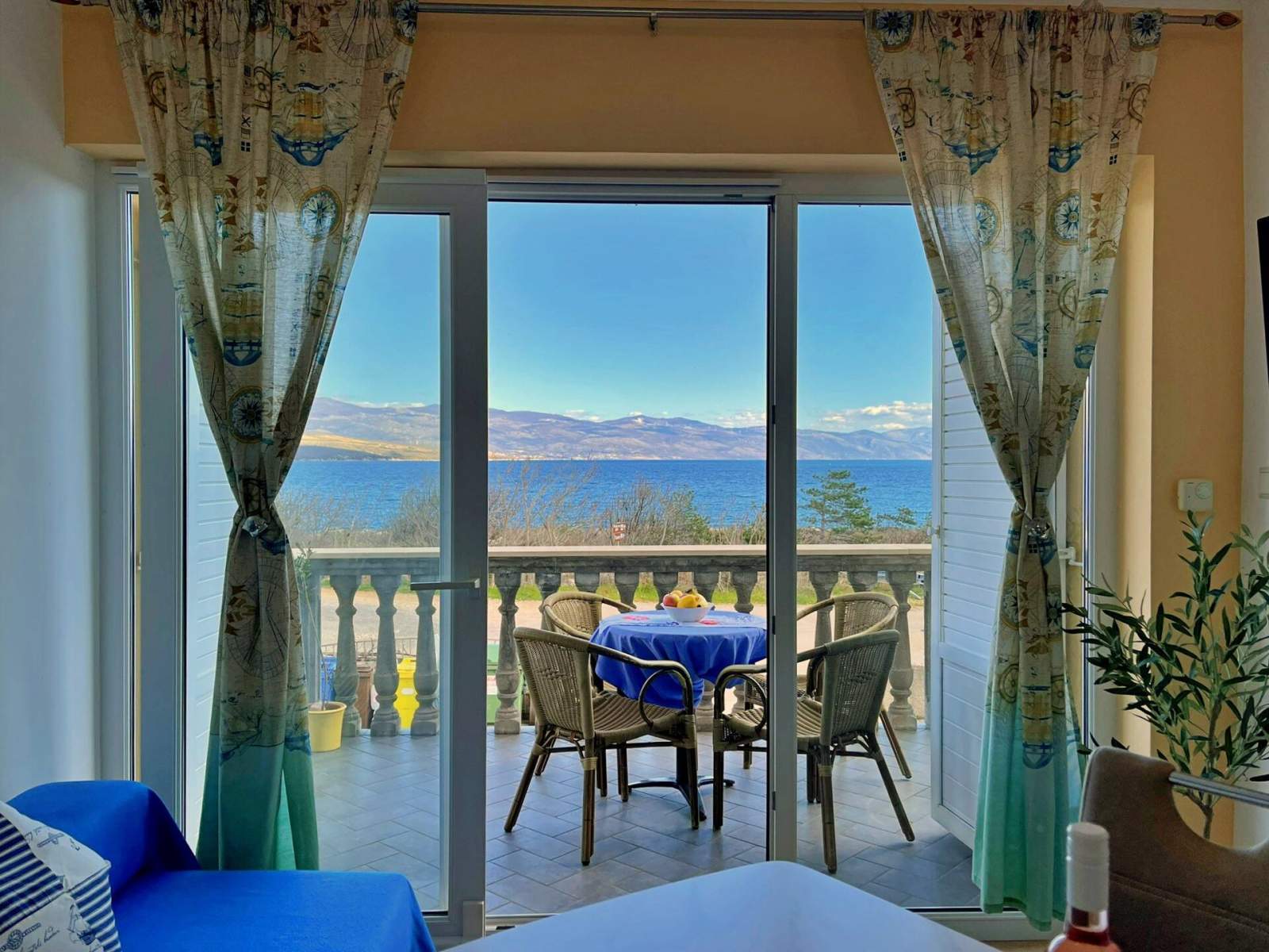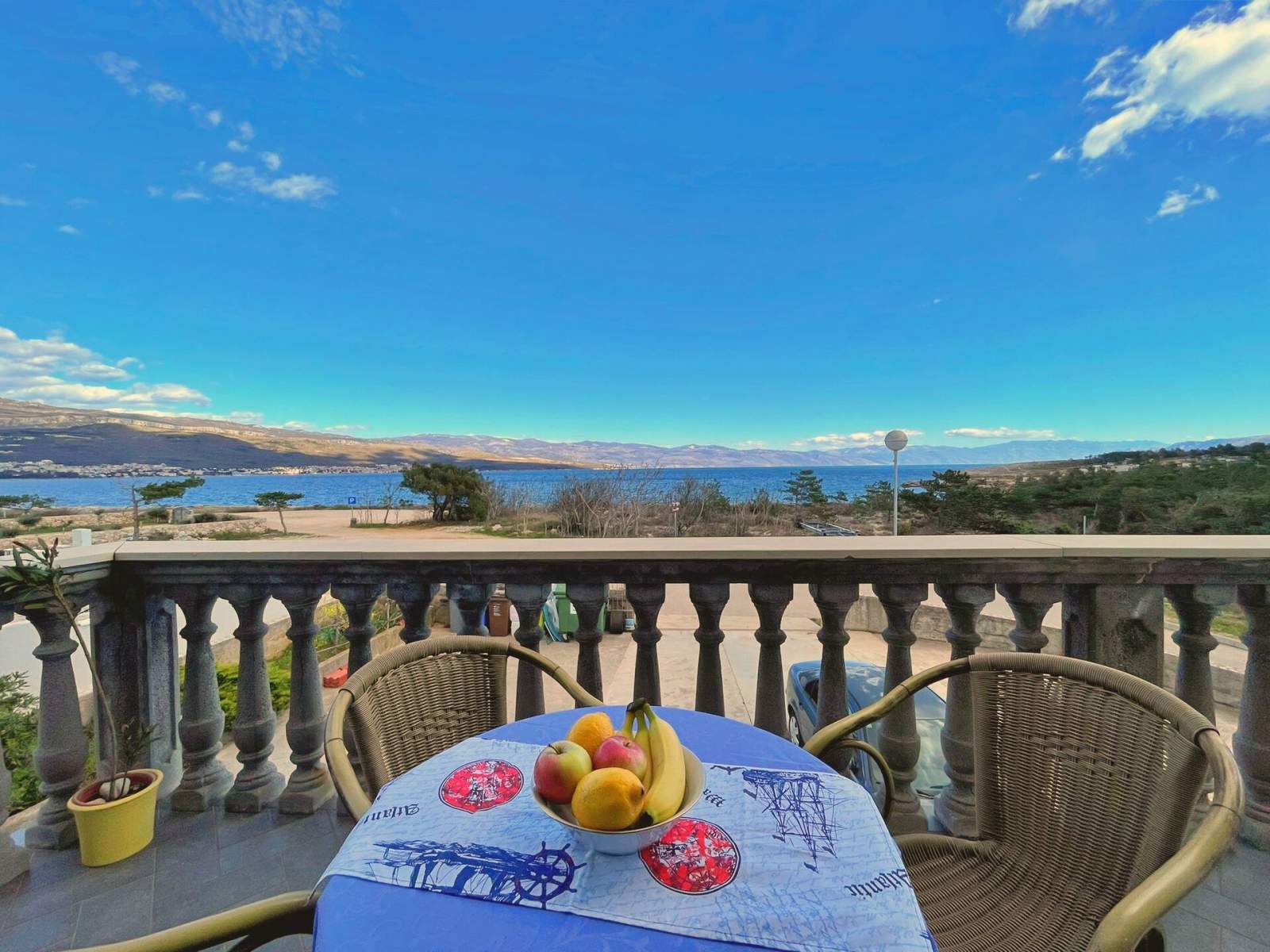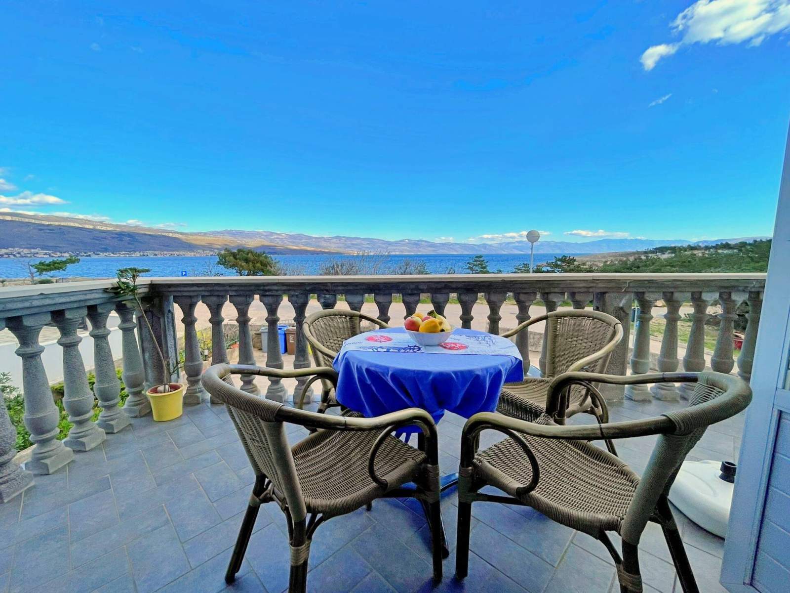 Ovaj apartman nalazi se samo 20 metara od mora i plaže na prvom katu i ima dvije spavaće sobe — jednu s bračnim krevetom i drugu s dva odvojena jednostruka kreveta. Otvoreni dnevni boravak, blagovaonica i kuhinja uključuju stol za blagovanje, kauč, klima uređaj i satelitsku/kabelsku TV. Kuhinja je opremljena indukcijskim štednjakom s 4 kola, hladnjakom sa zamrzivačem, aparatom za kavu, kuhalom za vodu i tosterom. Kupaonica ima tuš i WC. Zakoračite na privatni balkon (6 m2) s vanjskim namještajem i uživajte u pogledu prirodu, mirnu ulicu i more. Gostima su na raspolaganju posteljina, ručnici, besplatan Wi-Fi i parkirno mjesto. Popularni lokalni bistro i ronilački centar smješten je u prizemlju, nudeći tradicionalnu mediteransku kuhinju i podvodnu avanturu. U ronilačkom centru možete dogovoriti uron s broda ili s obale.