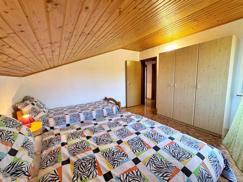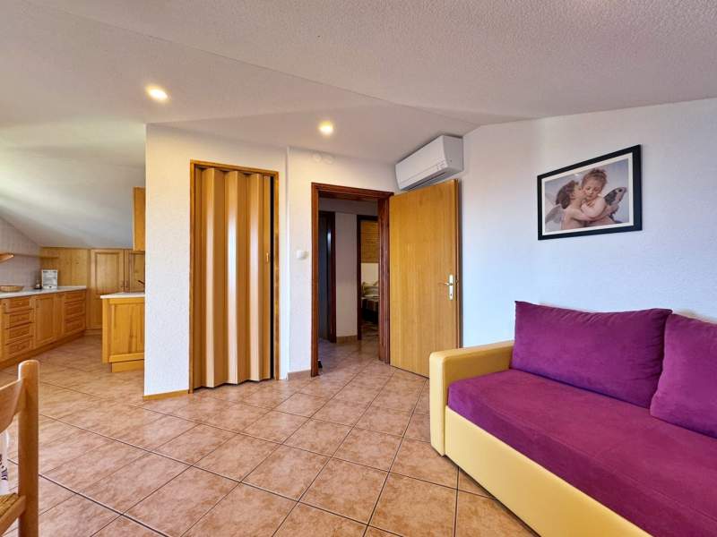 Ovaj apartman u potkrovlju, udaljen cca. 2,5 km od mora i plaže, nudi sve što je potrebno za opuštajući boravak. Ima prostrano zajedničko dvorište s roštiljem i mnogo mogućnosti parkiranja. Unutra se nalaze dvije spavaće sobe — jedna s bračnim krevetom, a druga s tri jednostruka kreveta, što ovja apartman čini idealnim za obitelji ili grupe. Ugodan klimatizirani dnevni boravak s pogledom na more opremljen je kaučem i stolom za blagovanje.
