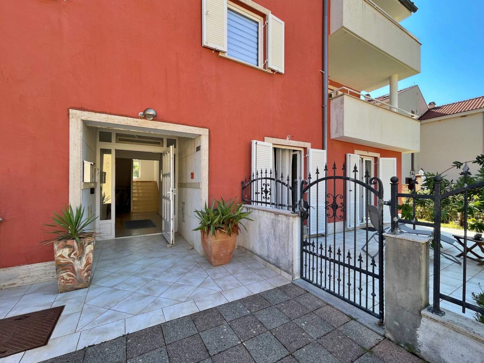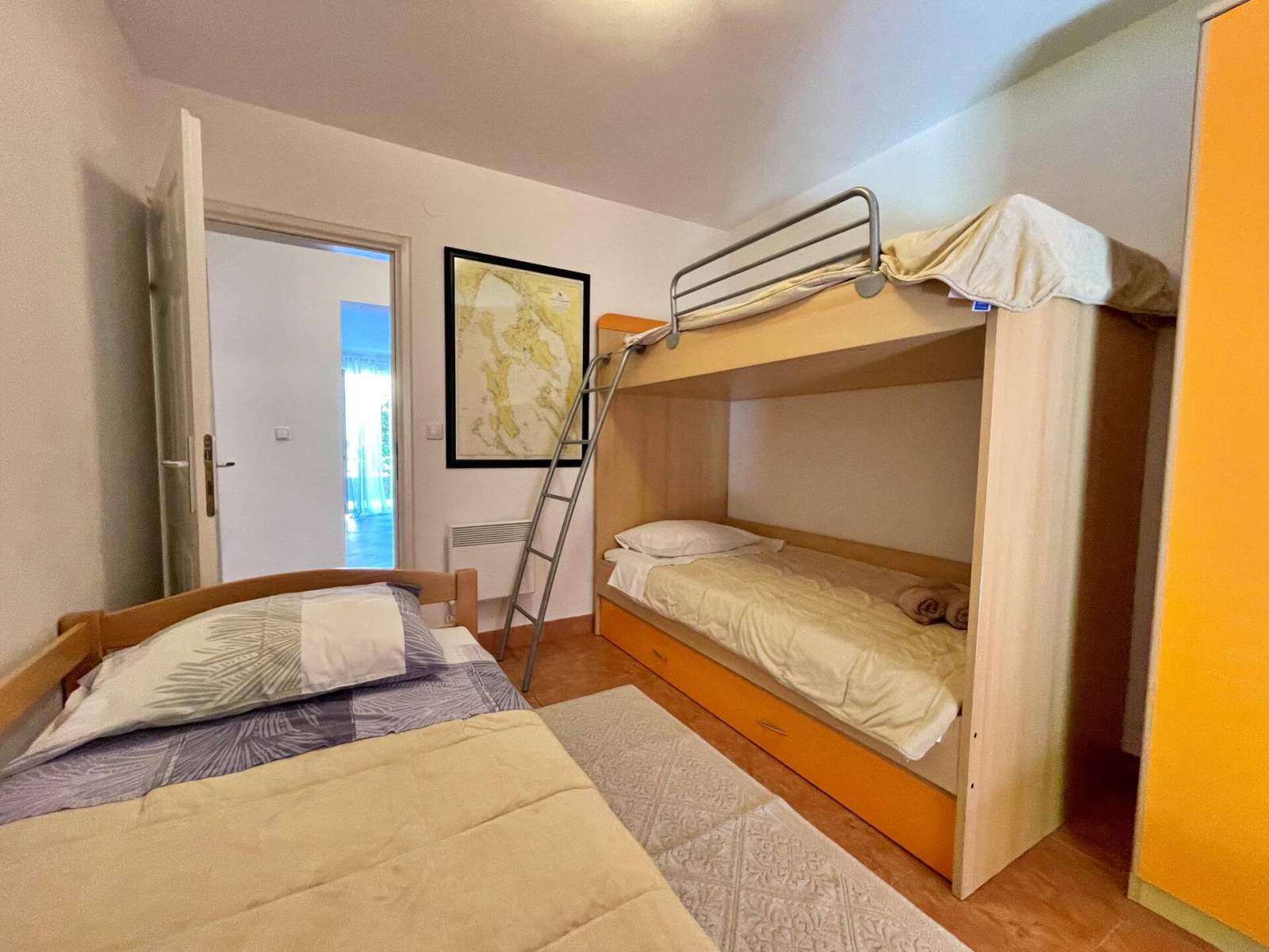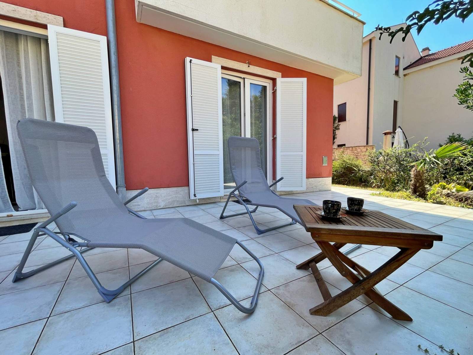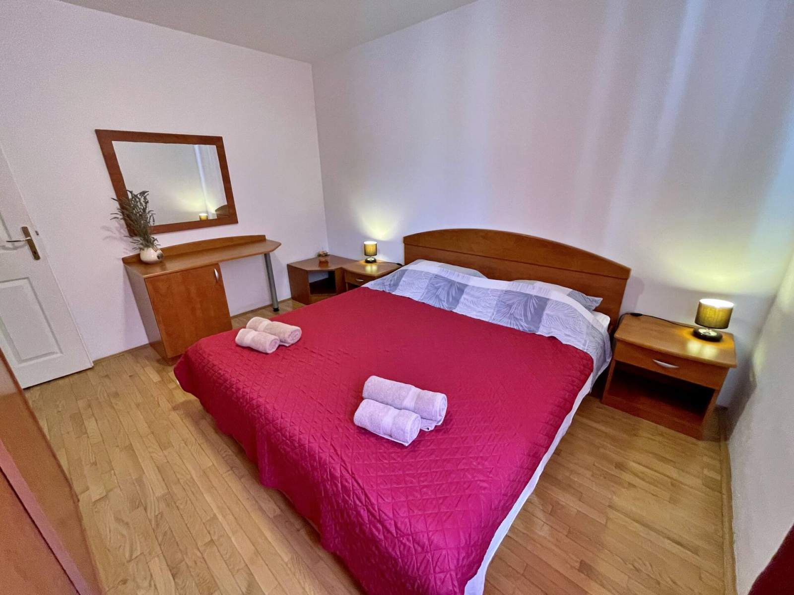 Doživite savršen spoj udobnosti i praktičnosti u ovom lijepo uređenom apartmanu, smještenom samo 100 metara od mora i u središtu mjesta. Uz dvije spavaće sobe, dobro opremljenu kupaonicu s tušem, bideom, perilicom rublja i WC-om te udoban dnevni boravak, pronaći ćete sve što vam je potrebno za Vaš odmor. Kuhinja je potpuno opremljena, a apartman se može pohvaliti i s dvije prostrane terase na kojima možete uživati u jutarnjoj kavi ili večernjem piću dok se odmarate na morskom povjetarcu. S nenatkrivene terase (20 m2) imate pogled na mirnu ulicu, a natrkivena terasa (20 m2) nalazi se u stražnjem dvorištu gdje možete uživati u potpunoj privatnosti.