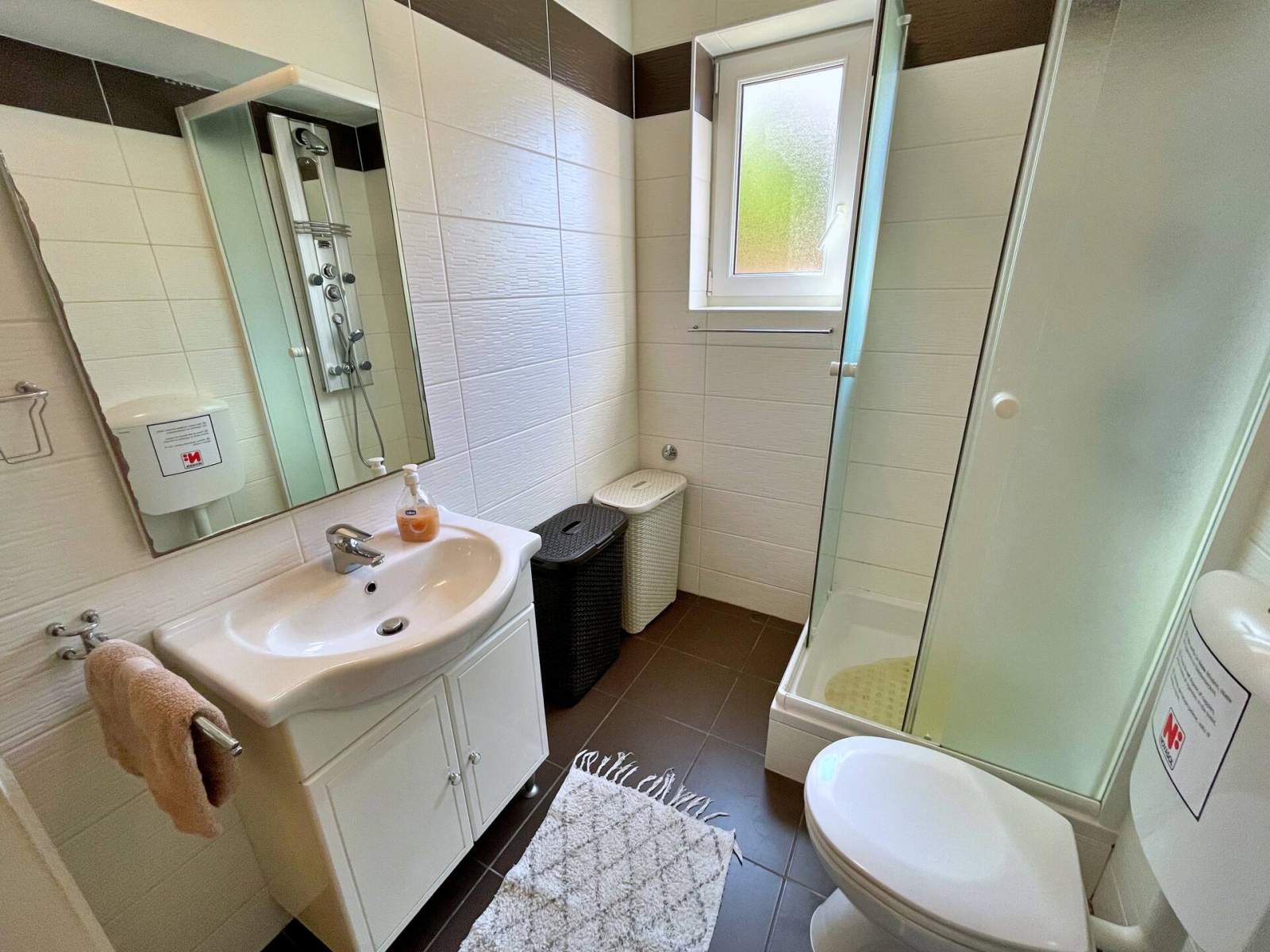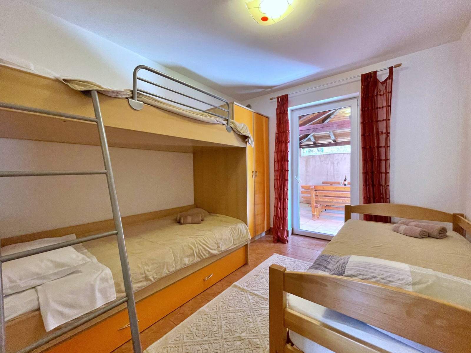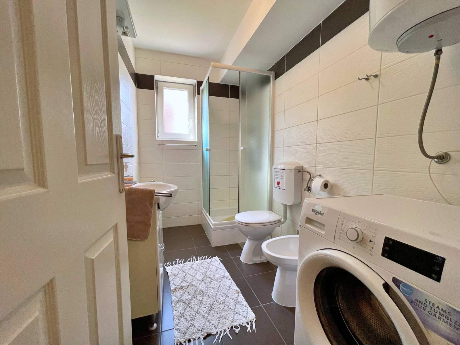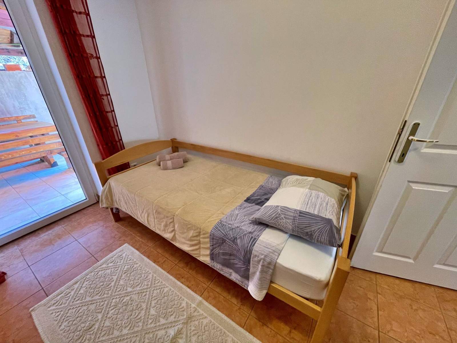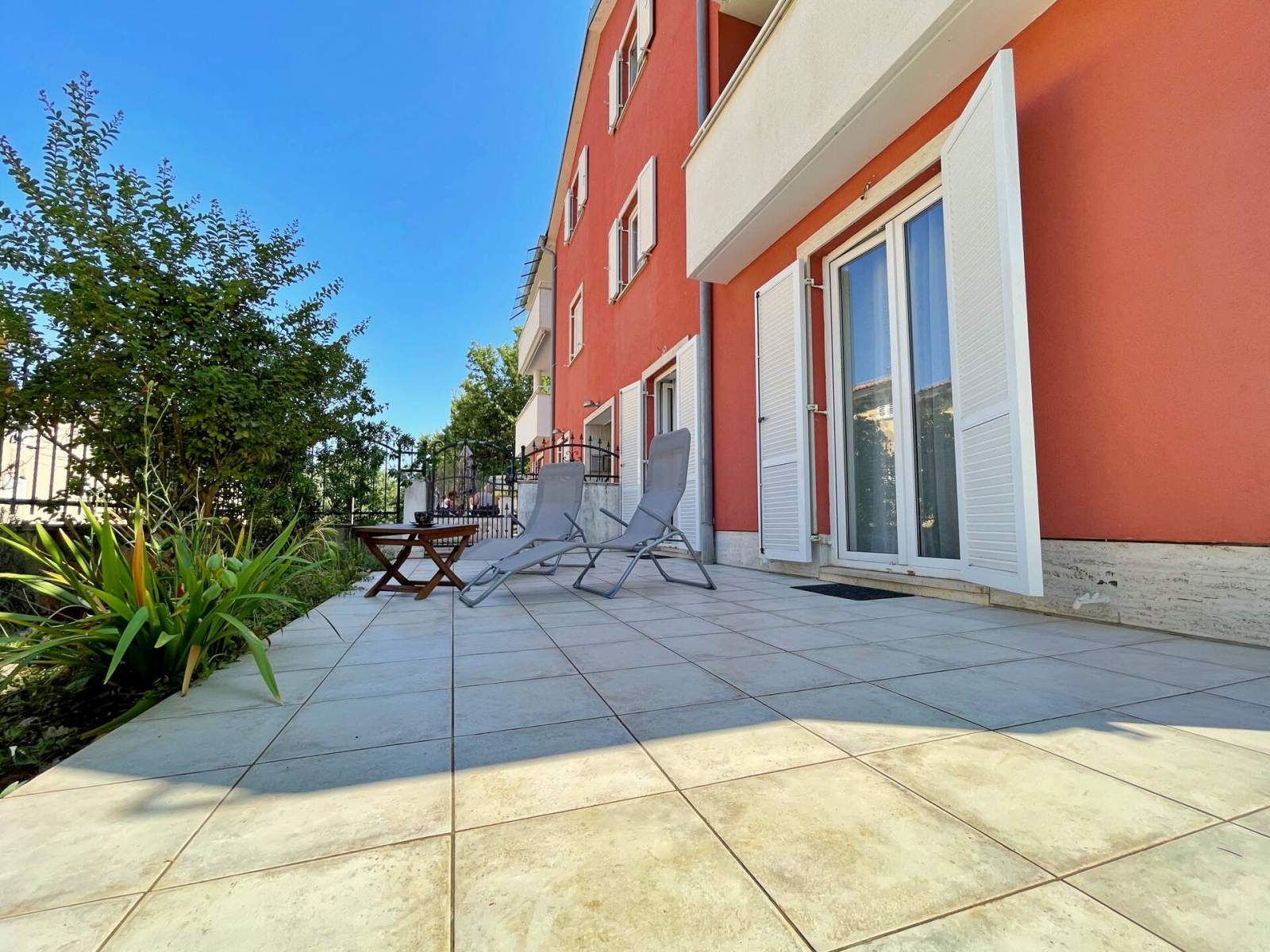 Doživite savršen spoj udobnosti i praktičnosti u ovom lijepo uređenom apartmanu, smještenom samo 100 metara od mora i u središtu mjesta. Uz dvije spavaće sobe, dobro opremljenu kupaonicu s tušem, bideom, perilicom rublja i WC-om te udoban dnevni boravak, pronaći ćete sve što vam je potrebno za Vaš odmor. Kuhinja je potpuno opremljena, a apartman se može pohvaliti i s dvije prostrane terase na kojima možete uživati u jutarnjoj kavi ili večernjem piću dok se odmarate na morskom povjetarcu. S nenatkrivene terase (20 m2) imate pogled na mirnu ulicu, a natrkivena terasa (20 m2) nalazi se u stražnjem dvorištu gdje možete uživati u potpunoj privatnosti.