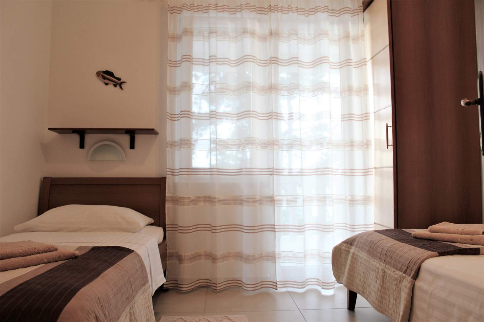 Ovaj dvosobni apartman nalazi se na povišenom prizemlju kuće koja je udaljena samo 15 metara od mora i plaže, s pogledom na more i u blizini restorana i ronilačkog centra. Potpuno opremljena kuhinja sadrži električni/plinski štednjak, mini-pećnicu, hladnjak sa zamrzivačem, aparat za kavu, kuhalo za vodu, toster, perilicu posuđa i ručni mikser. Dnevni boravak/blagovaona ima kauč, stol za blagovanje, SAT TV, Wi-Fi i klima uređaj. Jedna spavaća soba ima bračni krevet, dok druga ima dva odvojena kreveta. Kupaonica uključuje tuš, WC i sušilo za kosu. Uživajte u natkrivenoj terasi od 25 m2 s blagovaonskim stolom, suncobranom, ležaljkama i pogledom na more. Vrt s roštiljem i vanjskim tušem pridodaje vanjskom prostoru. Privatni parking je dostupan, a posteljina, ručnici i glačalo su Vam također osigurani.