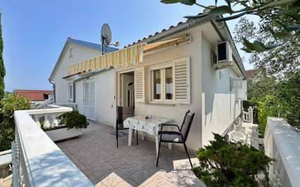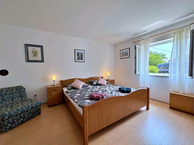 Ovaj apartman u prizemlju, udaljen samo 500 m od mora i centra mjesta, nudi ugodan boravak s dvije spavaće sobe od kojih svaka ima bračni krevet. Dnevni boravak uključuje stol za blagovanje, SAT TV i klima uređaj. Potpuno opremljena kuhinja ima indukcijski štednjak s 4 kola, pećnicu, hladnjak sa zamrzivačem, aparat za kavu, kuhalo za vodu, toster i perilicu posuđa. Vani se opustite na natkrivenoj terasi od 20 m2 s pogledom na dvorište i mirnu ulicu, koju dijelite sa susjednim apartmanom. Dodatne pogodnosti uključuju zajednički roštilj, besplatno parkiralište te osiguranu posteljinu i ručnike.