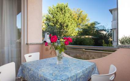 Ovaj prostrani apartman od 50 m2 u prizemlju prima 4-5 gostiju i ima 2 spavaće sobe, potpuno opremljenu kuhinju, dnevni boravak s pomoćnim ležajem i kupaonicu.