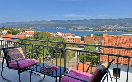 Prostrani apartman na samo 230 m od mora, s balkonom i prekrasnim pogledom na more. Ima dvije spavaće sobe s bračnim krevetima, veliki dnevni boravak s klimom i TV-om te potpuno opremljenu kuhinju. Uključeni su Wi-Fi, privatni parking, satelitska TV i perilica rublja. Nalazi se u centru – idealno za ugodan i opuštajući odmor uz more.