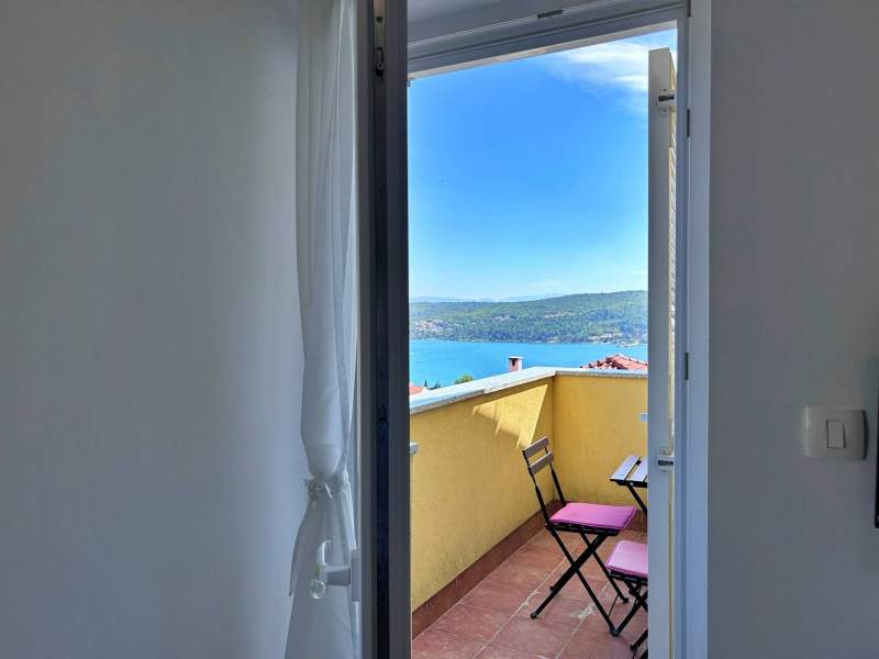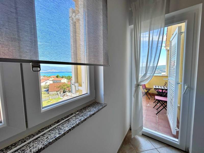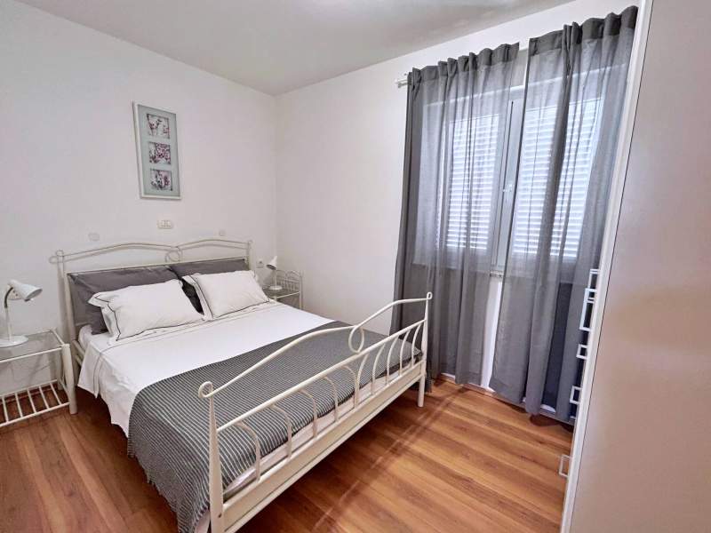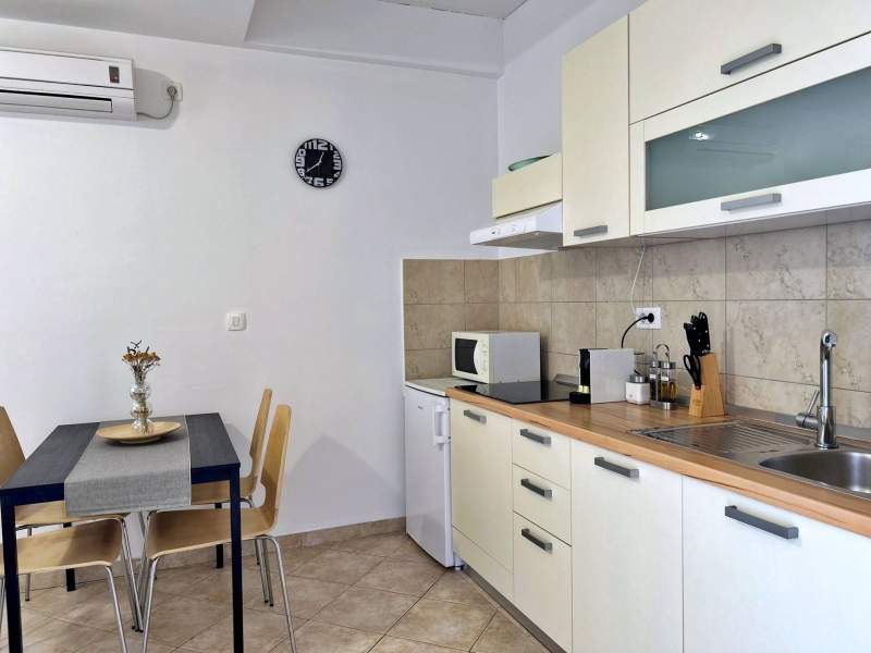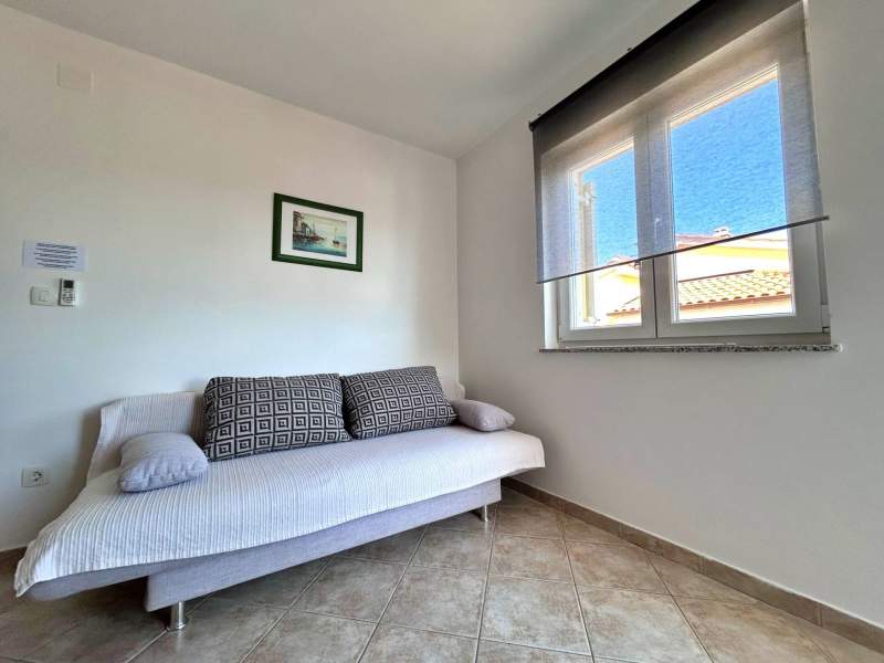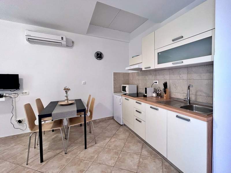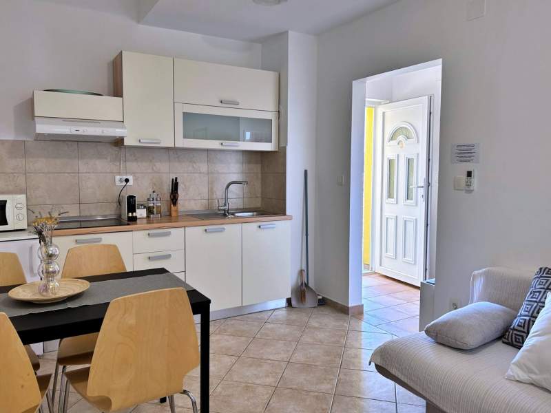 Located on the second floor, this cozy apartment features a 4 m2 private balcony with sea view. The air-conditioned kitchen and living area include a ceramic stove, fridge with freezer compartment, Nespresso coffee machine, kettle, microwave, toaster, dining table, pull-out couch for two, cable/satellite TV, and Wi-Fi, with direct access to the balcony. The bedroom offers a queen bed, and the bathroom includes a shower, toilet, and hairdryer. Guests can enjoy a shared BBQ and terrace in the yard, with free private parking in front of the building. Pets are welcome for an additional fee, and a baby cot is available upon request. (English)