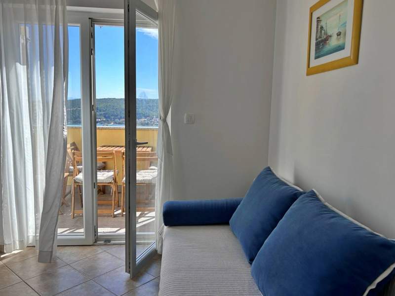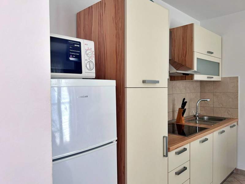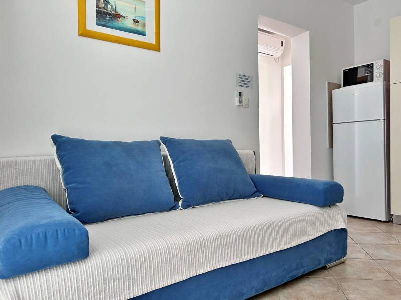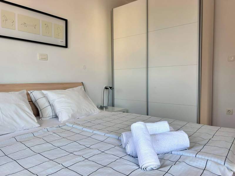 Located on the second floor, this cozy apartment features a 7 m2 private balcony with sea view. The air-conditioned kitchen and living area include a ceramic stove, fridge with freezer compartment, Nespresso coffee machine, kettle, microwave, toaster, dining table, pull-out couch for two, cable/satellite TV, and Wi-Fi, with direct access to the balcony. There are two bedrooms: one with a queen bed, and the other with one single bed. The bathroom includes a shower, toilet, and hairdryer. Guests can enjoy a shared BBQ and terrace in the yard, with free private parking in front of the building. Pets are welcome for an additional fee, and a baby cot is available upon request. (English)